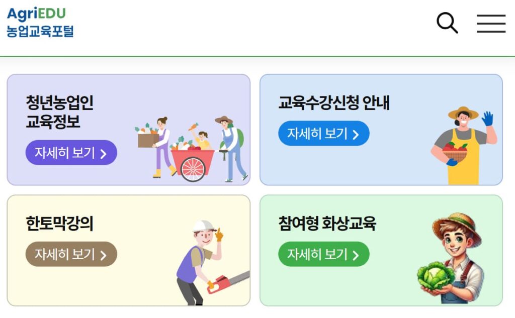 농업교육포털(AgriEdu)은 농림축산식품부에서 운영하는 농업 교육 통합 플랫폼으로 농업인과 예비 농업인을 위한 다양한 교육 프로그램을 제공하는 공식 농업 교육 사이트입니다.