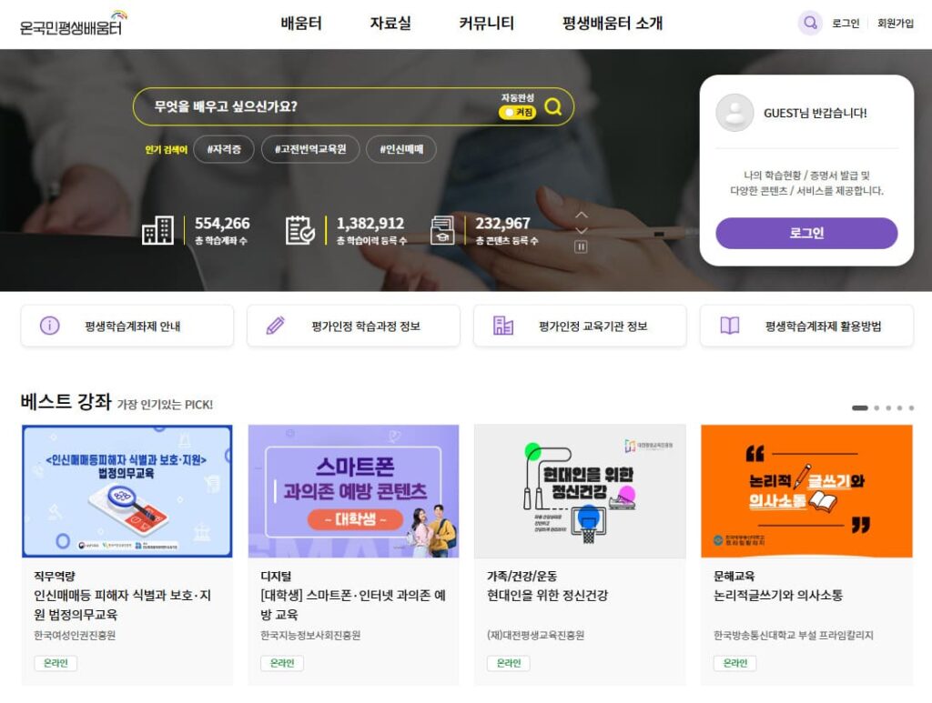 온라인으로 다양한 강좌와 교육과정을 검색·수강하고, 평생교육 정보를 확인하며, 개인별 학습 이력을 관리할 수 있도록 지원하는 통합 서비스입니다.